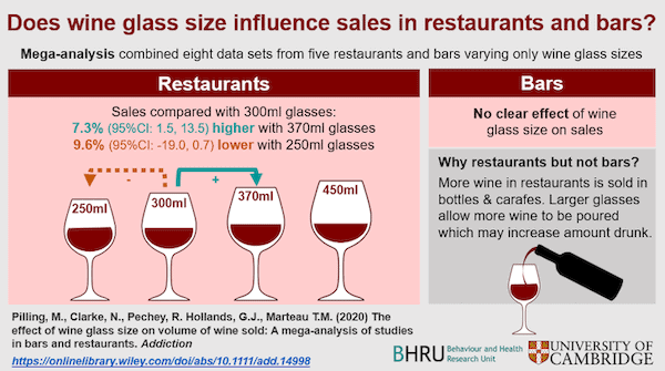 One reason is that in restaurants more wine may be sold in bottles or carafes, rather than by the glass, which requires free-pouring by customers or staff. For example, if you are out for a meal, you might get a bottle of wine for the table, which you or restaurant staff would then pour into glasses. In a bar, you might order a fixed portion in a standard measure, such as a 175ml glass of wine. Pouring wine from a bottle or a carafe allows people to pour more than a standard serving size, an effect that may increase with the size of the glass. People may still think of this as ‘one glass of wine’, and drink the same number of glasses as they usually would with a smaller glass and, consequently, drink more wine with larger glasses. It is also possible that wine glass size does affect sales in bars but the effect may be smaller than our study was able to detect.