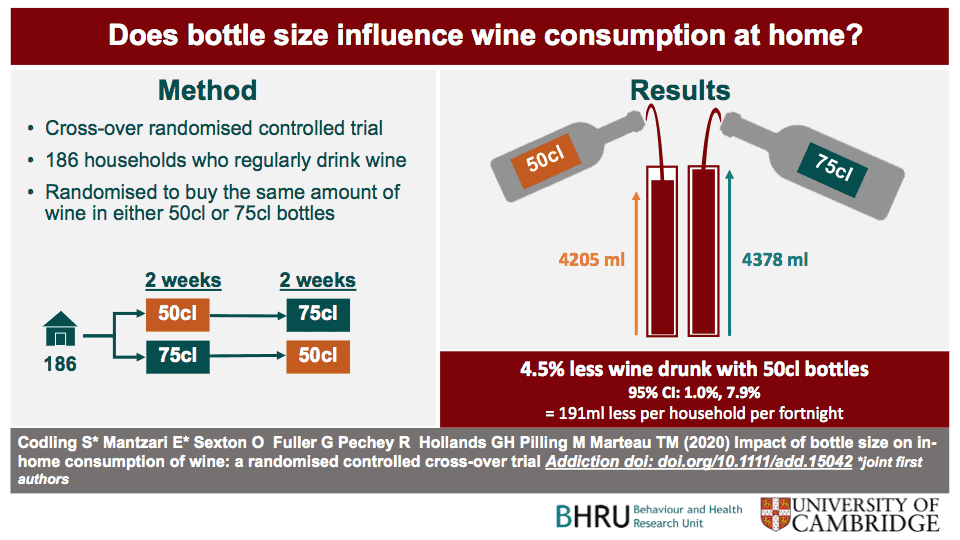 Written by Eleni Mantzari & Theresa M Marteau, from the Behaviour and Health Research Unit at the University of Cambridge. The paper ‘Impact of bottle size on in-home consumption of wine: a randomized controlled cross-over trial‘ was written by Saphsa Codling, Eleni Mantzari, Olivia Sexton, Georgia Fuller, Rachel Pechey, Gareth J. Hollands, Mark Pilling and Theresa M. Marteau and published in Addiction.