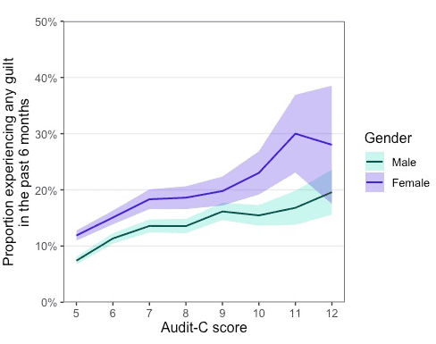 One of the clearest findings was that women were more likely than men to report guilt or remorse after drinking — even after accounting for how much they drank and whether they had experienced alcohol-related harm.