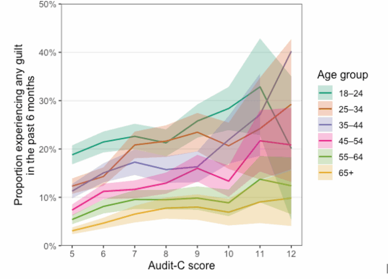 Cohort effects may explain this. For example, changing attitudes with younger generations growing up with stronger messages about health, mental wellbeing, and “responsible” drinking. Older adults may generally be better at dealing with guilt and remorse based on longer-life experience and critical self-reflection may be less severe. More specifically, older adults may be accustomed to their drinking patterns, better able to manage negative feelings, or more likely to minimise harms if they have not experienced serious consequences of guilt.