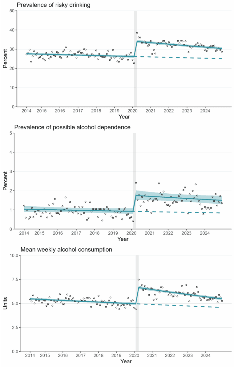 Meanwhile, alcohol-specific deaths in England reached record highs in 2023 and remained elevated in 2024. This aligns with the study’s finding that dependent drinking has not returned to pre-pandemic levels.