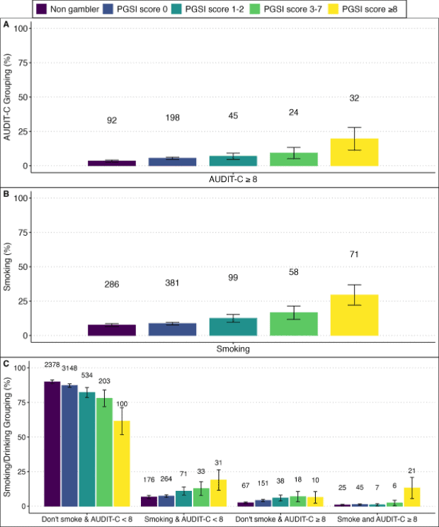 We found that levels of risky drinking (AUDIT-C score) increased in step with each of the four levels of gambling-related risk (according to the Problem Gambling Severity Index), from gambling without experiencing adverse consequences, to disordered gambling. Likewise, elements of loss of control of gambling (spending more than intending, ignoring spending limits or having a self-reported gambling “binge”), and tobacco smoking, followed a similar “dose dependent” pattern. Interestingly, we also found that those with the highest risk score (scores ≥8 on the PGSI; indicative of disordered gambling) experienced notable clustering of concurrent smoking and high-risk drinking (AUDIT-C ≥8).