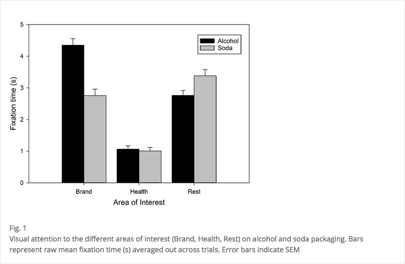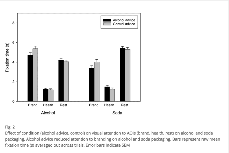 Results from study 1 showed that over the 15-second period, participants noticed alcohol warning labels for an average of 1.03 seconds, 7% of the total time period (see fig1). They paid less attention to health signs than to the branding and the rest of the label. Study 2 similarly showed that the alcohol brief intervention decreased attention to branding compared to the control condition, but it did not affect attention to warning labels; attention was paid to them for 1.2 seconds, 8% of the time period (see fig2).