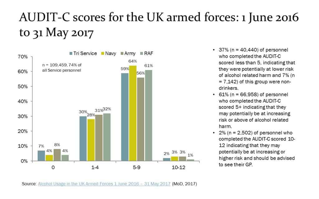 Of the 109,459 staff who completed the questionnaire, 61% (66,958) of armed forces personnel scored 5+, indicating that they may potentially be at increasing risk or above of alcohol-related harm.