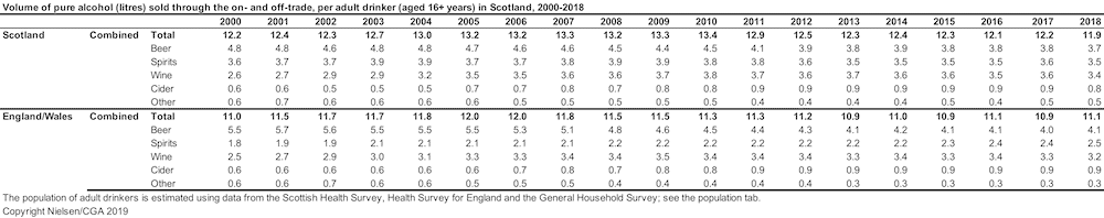 At 9.9 litres of pure alcohol per adult, the volume of alcohol sold per adult in Scotland in 2018 was 9% higher than in England and Wales (9.1 litres), the smallest gap between nations since 2002.