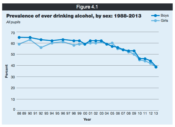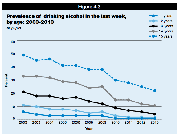 The long-term decline in the proportion of school children who report regular drinking is continuing. In 2013, 9% of pupils had drunk alcohol in the last week, less than half the level in 2003 when the figure was 25%.