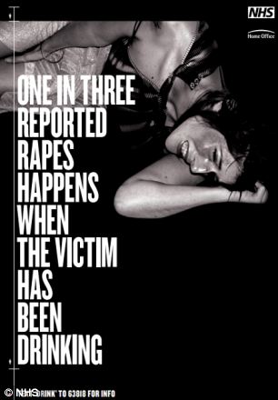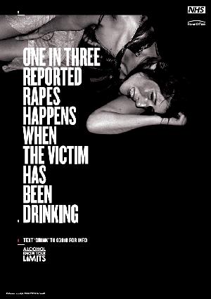 The poster pictures a distraught looking young woman accompanied by the words ‘One in three rapes happens when the victim has been drinking’.