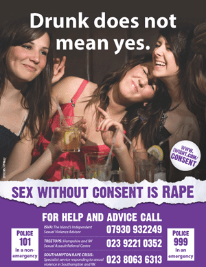 A current awareness campaign being held in the Isle of Wight, designed to improve knowledge around consent and rape and to expose rape ‘myths’, confronts the issue of drunkenness directly with a poster (see below left) that offers a different emphasis to that of the Know Your Limits campaign. The tag line of the poster is “Drunk does not mean yes“.