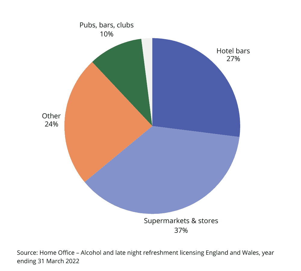 • Recently, supermarkets and stores overtook hotel bars as the most likely premises to have a 24-hr alcohol licence.