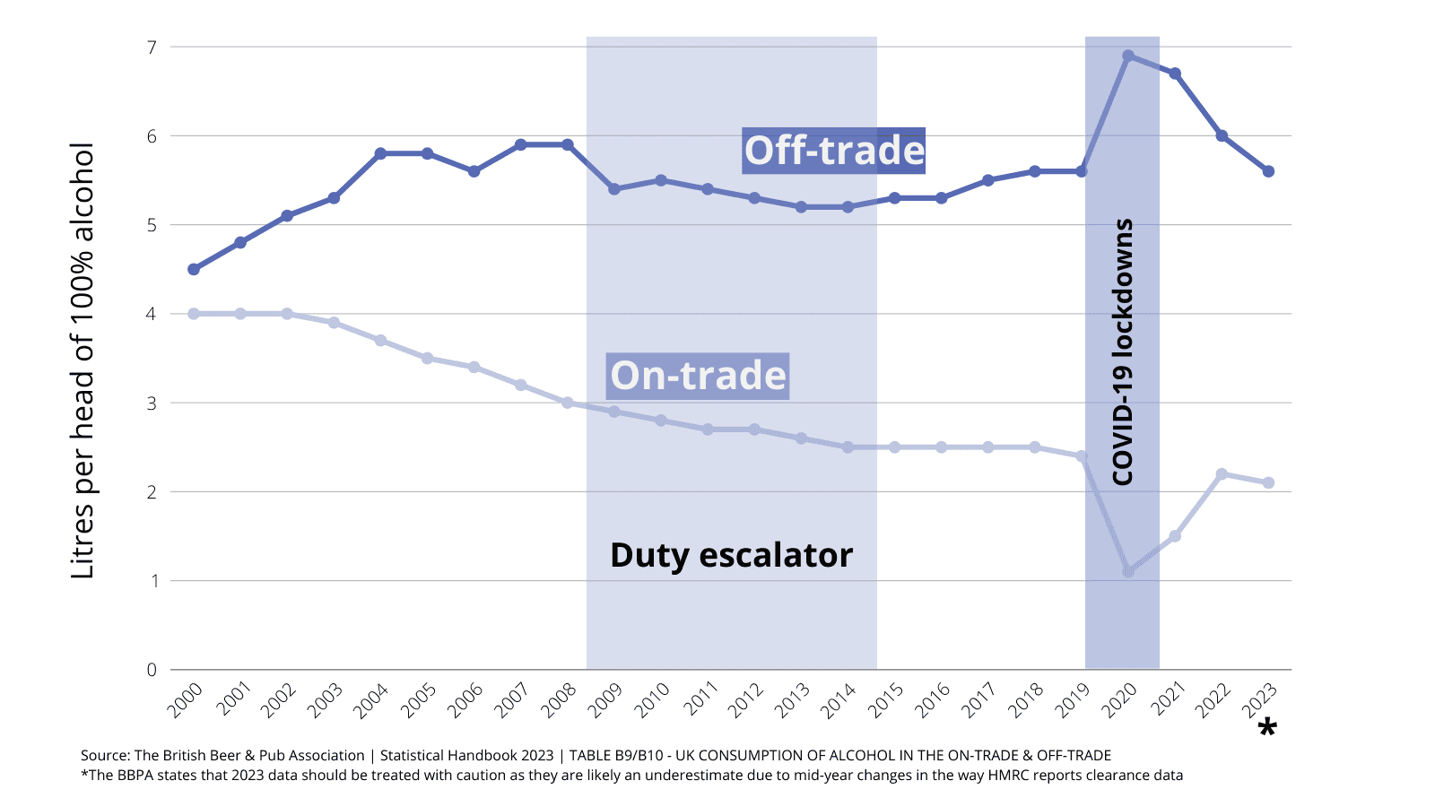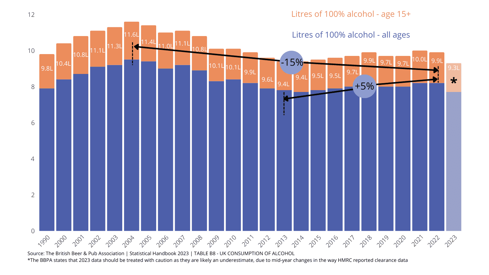 - On-trade consumption among adults in the UK (ie drinking alcohol sold in pubs, nightclubs and hotels) declined by 1.8 litres of pure alcohol per person since 2000.