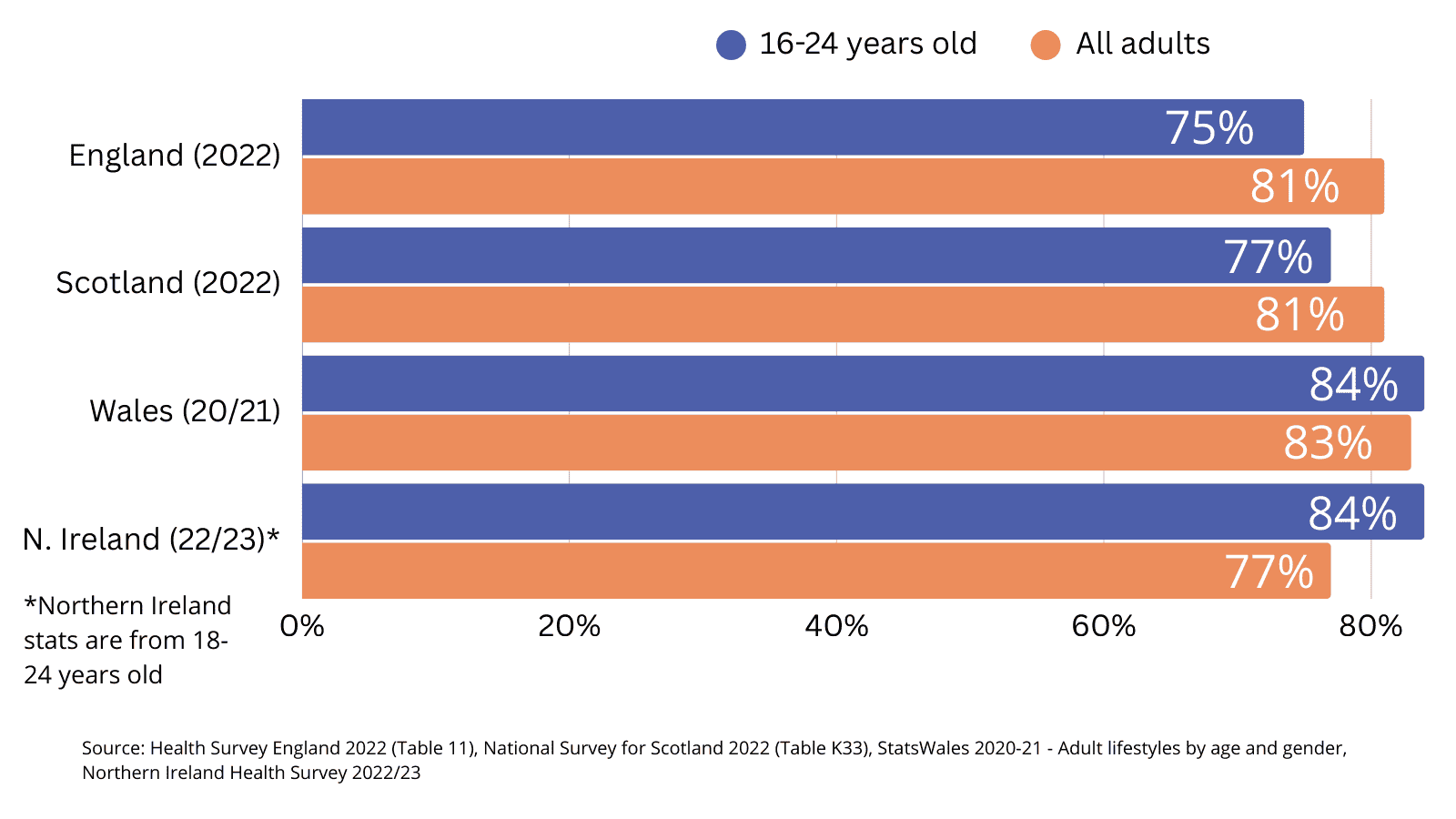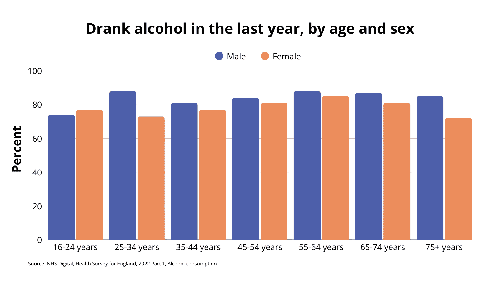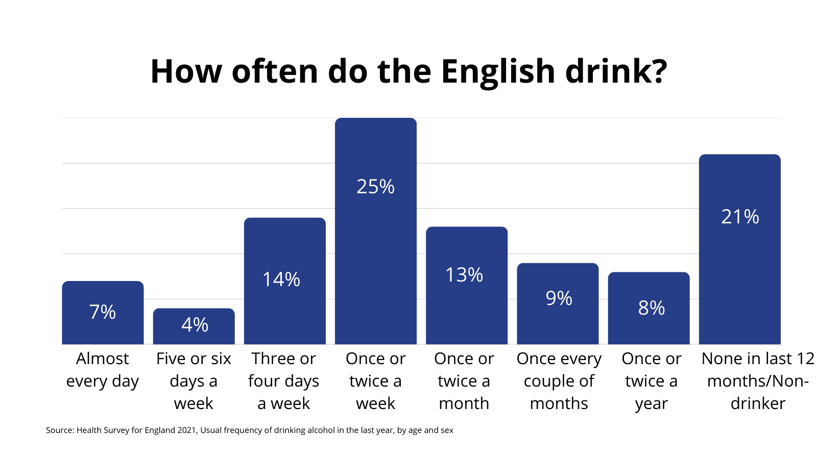 - In England in 2022, 19% had not drunk alcohol in the last 12 months (NHS, 2024)