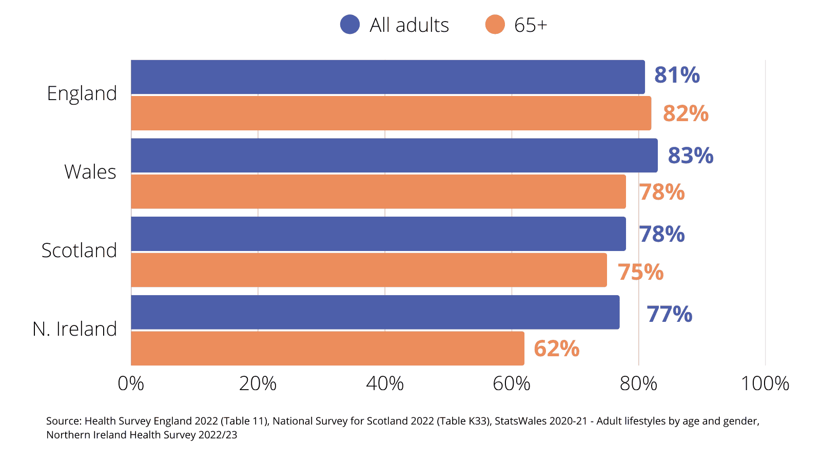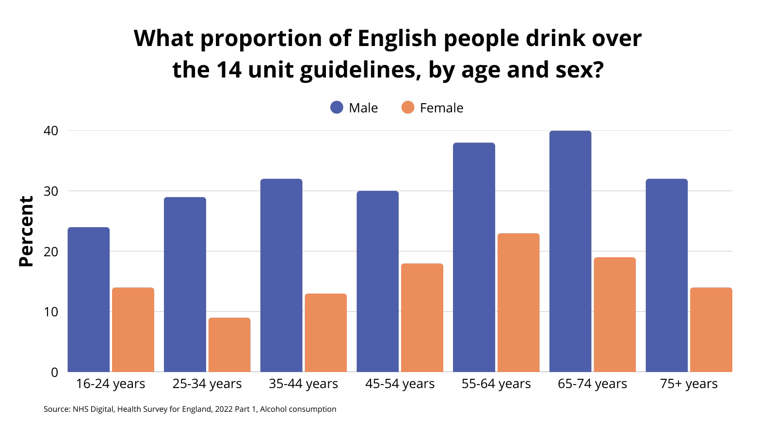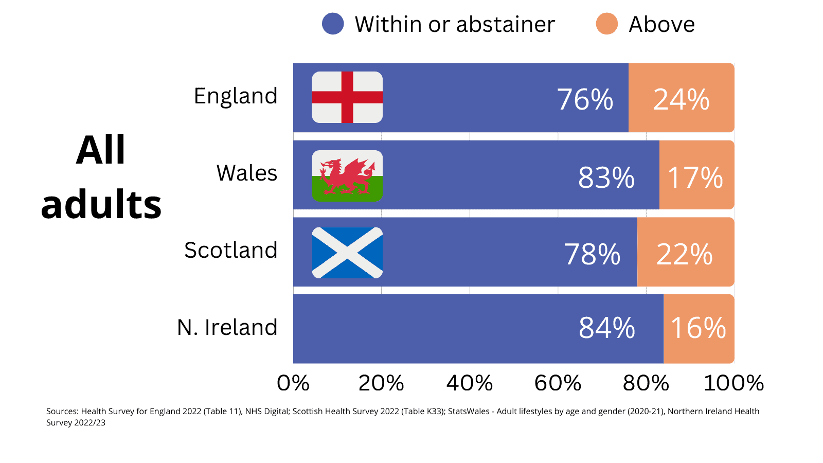 - 24% of English, 17% of Welsh, 22% of Scottish, and 16% of Northern Irish people consume alcohol at an increasing and higher risk, meaning that they drink more than 14 units in a week.