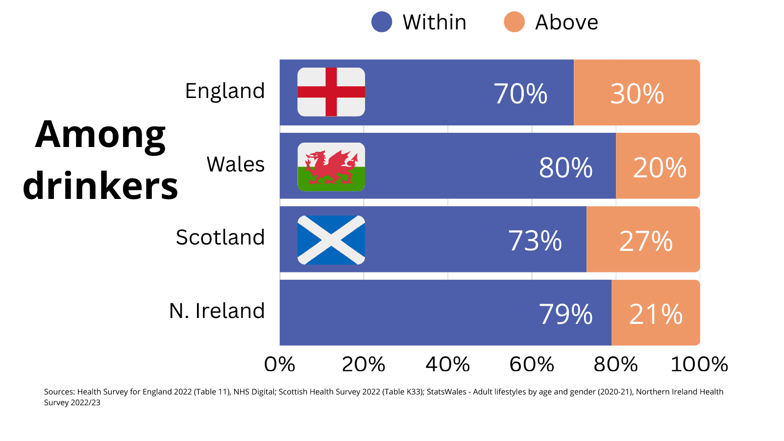 - Among drinkers, 30% of English, 20% of Welsh, 27% of Scottish, and 21% of Northern drinkers consume over 14 units a week.