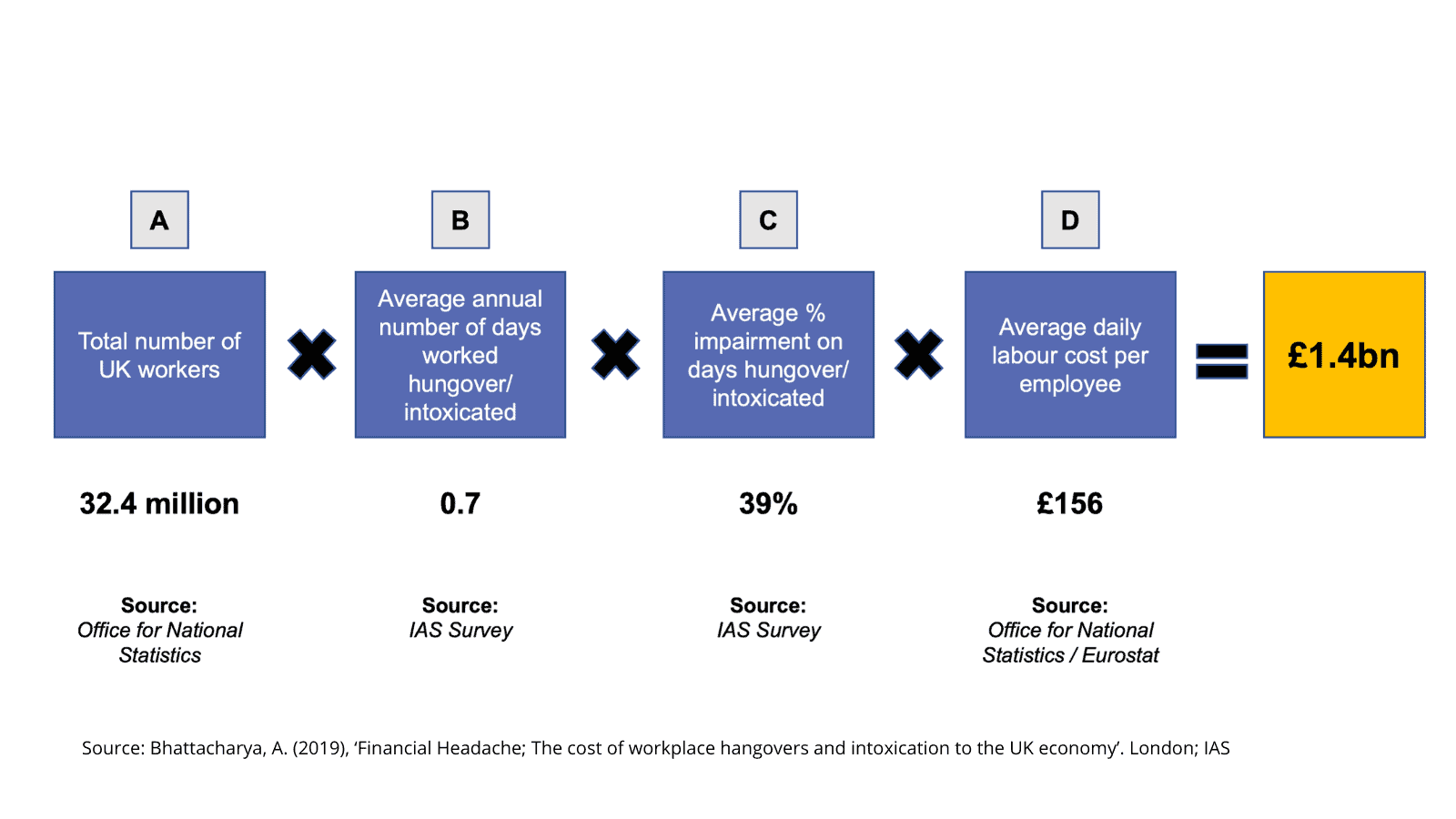 - Every year, workplace hangovers are estimated to cost the UK economy between £1.2 and £1.4 billion. (IAS, 2019)
