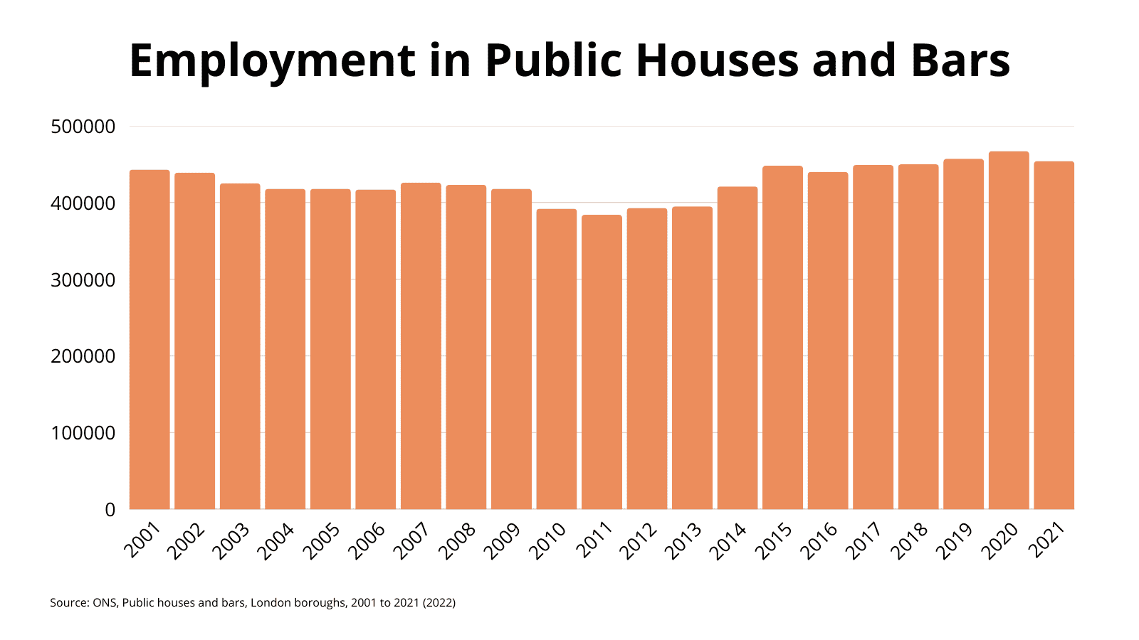 - Employment in pubs has remained very stable in recent years, despite many establishments closing. This suggests larger pubs have gained share at the expense of smaller ones.
