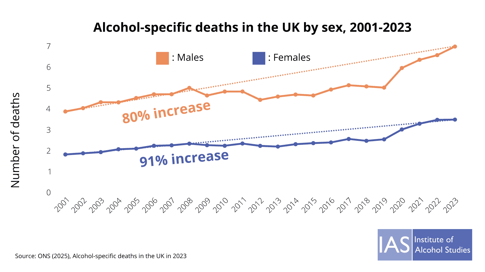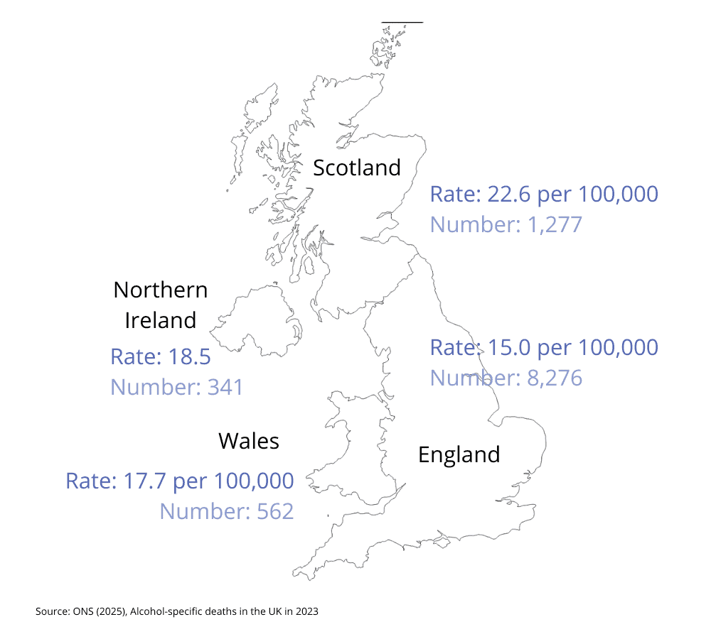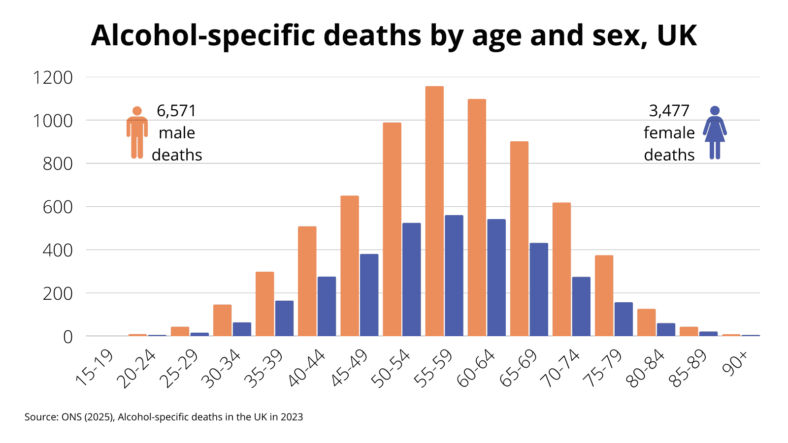 - Across the UK, the alcohol-specific death rate for males is twice the rate for females (ONS, 2025)