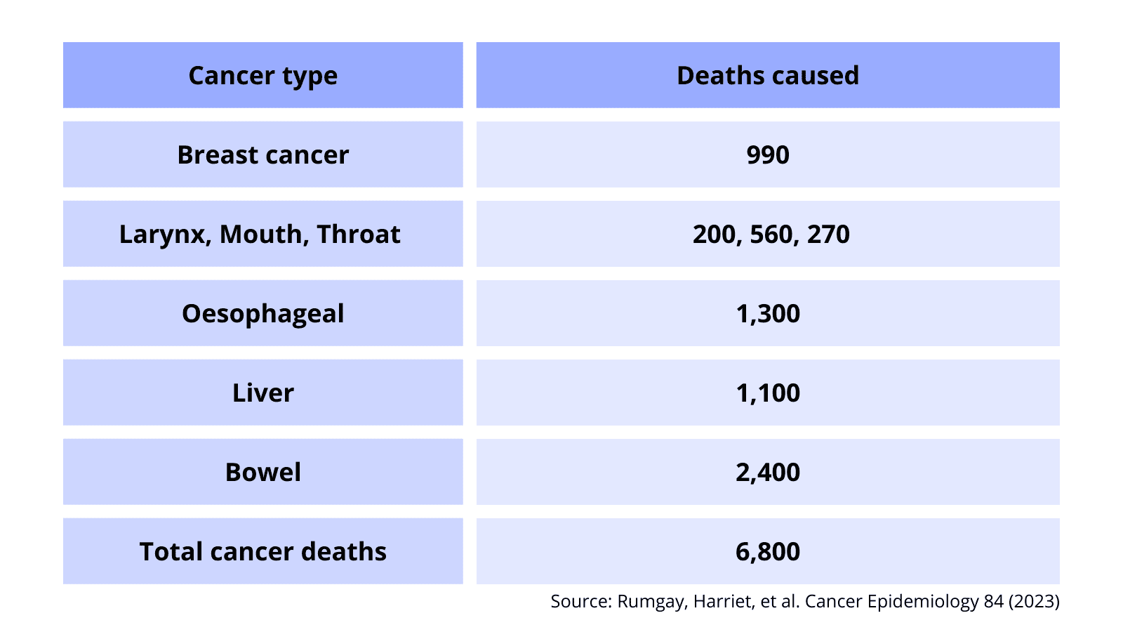 - Alcohol-related cancers cause a similar number of deaths to alcohol-related liver disease