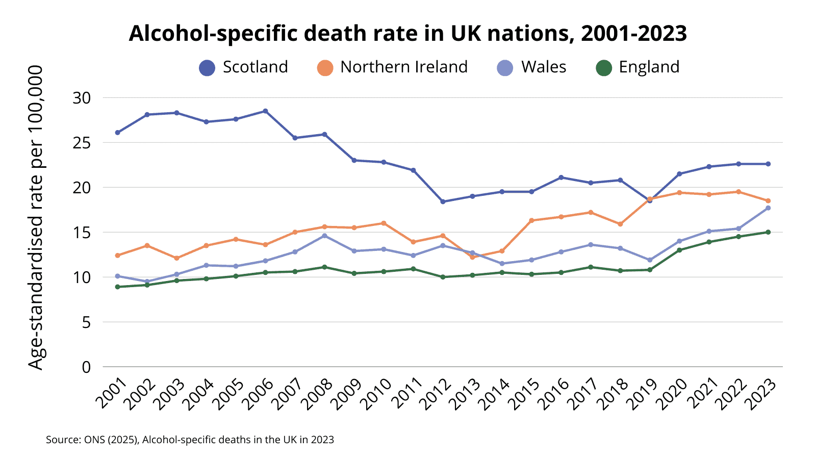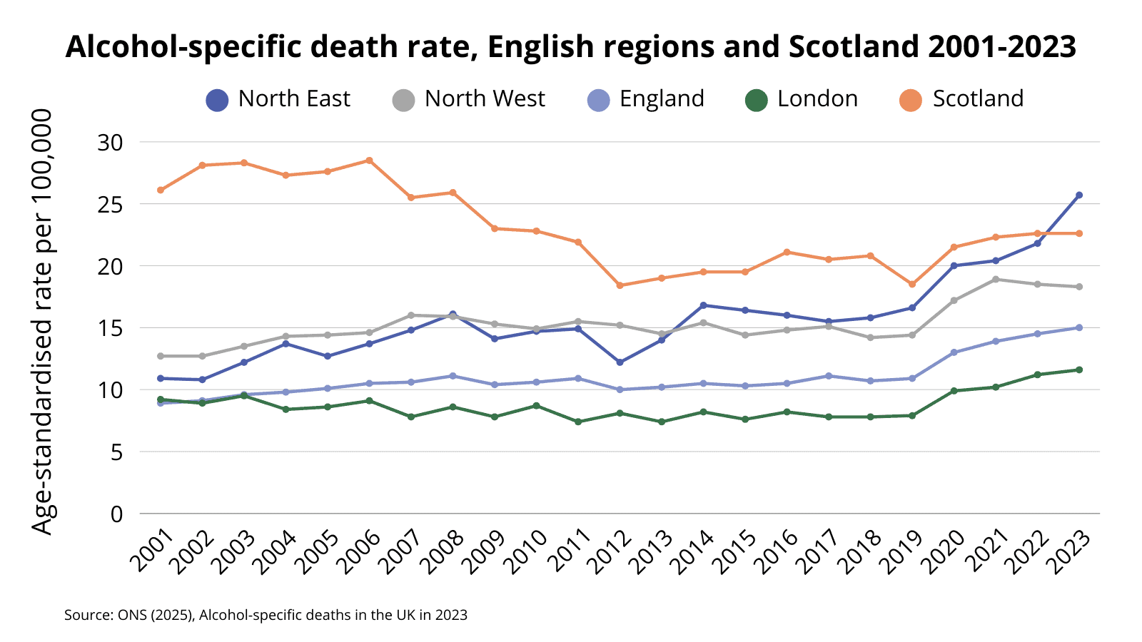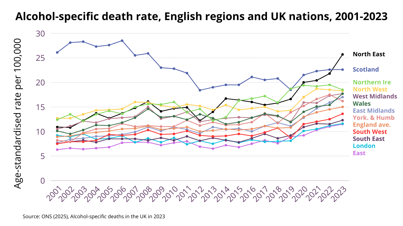 - The alcohol-specific death rate is 50% higher in the North East relative to the English average. (ONS, 2025)