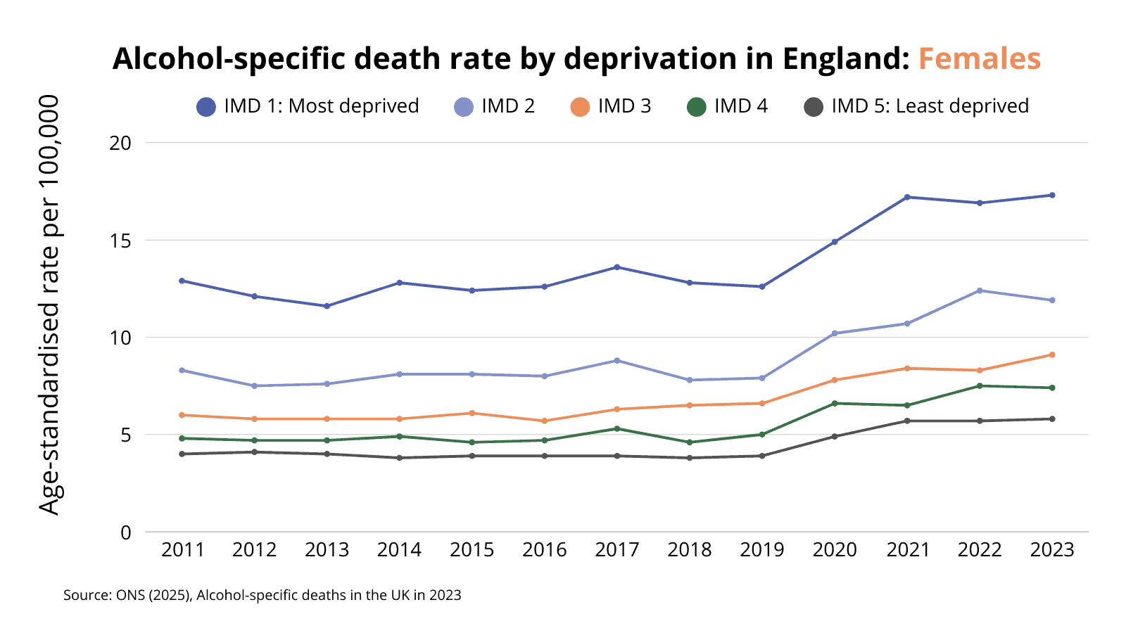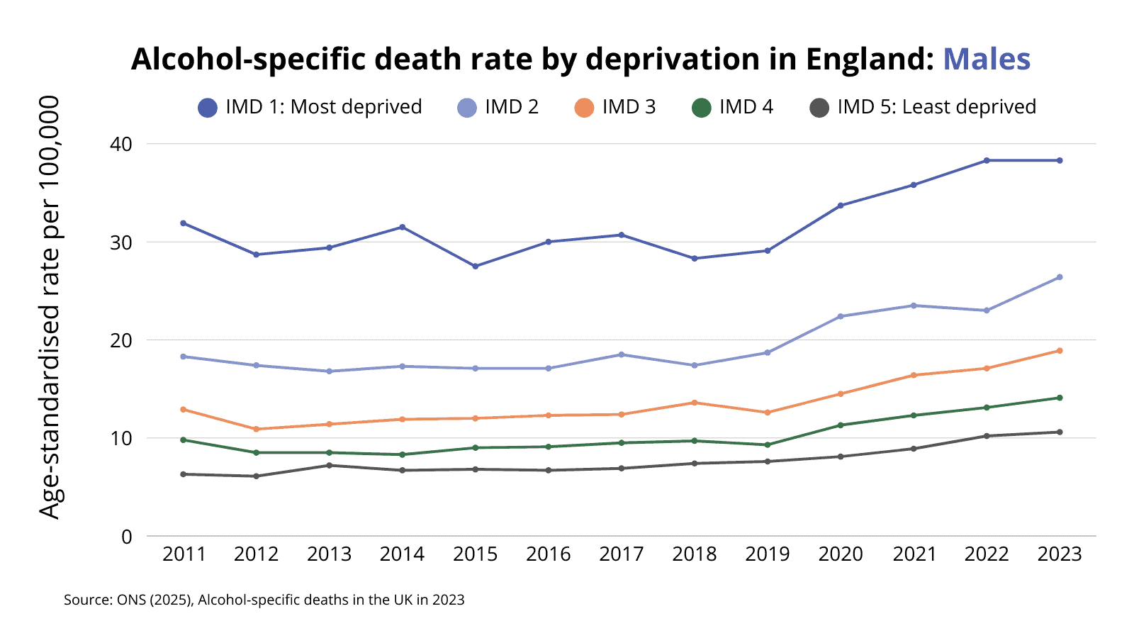 - Male alcohol-specific deaths in England and Wales are 4 times higher in the most deprived areas than the least deprived areas. (ONS, 2025)