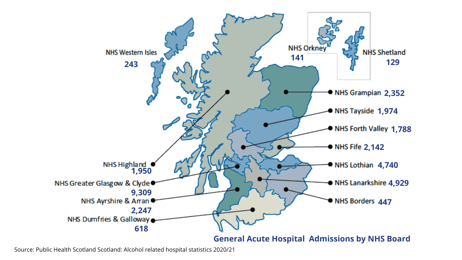 - 31,206 alcohol-related hospital admissions in Scotland (PHS, 2024).