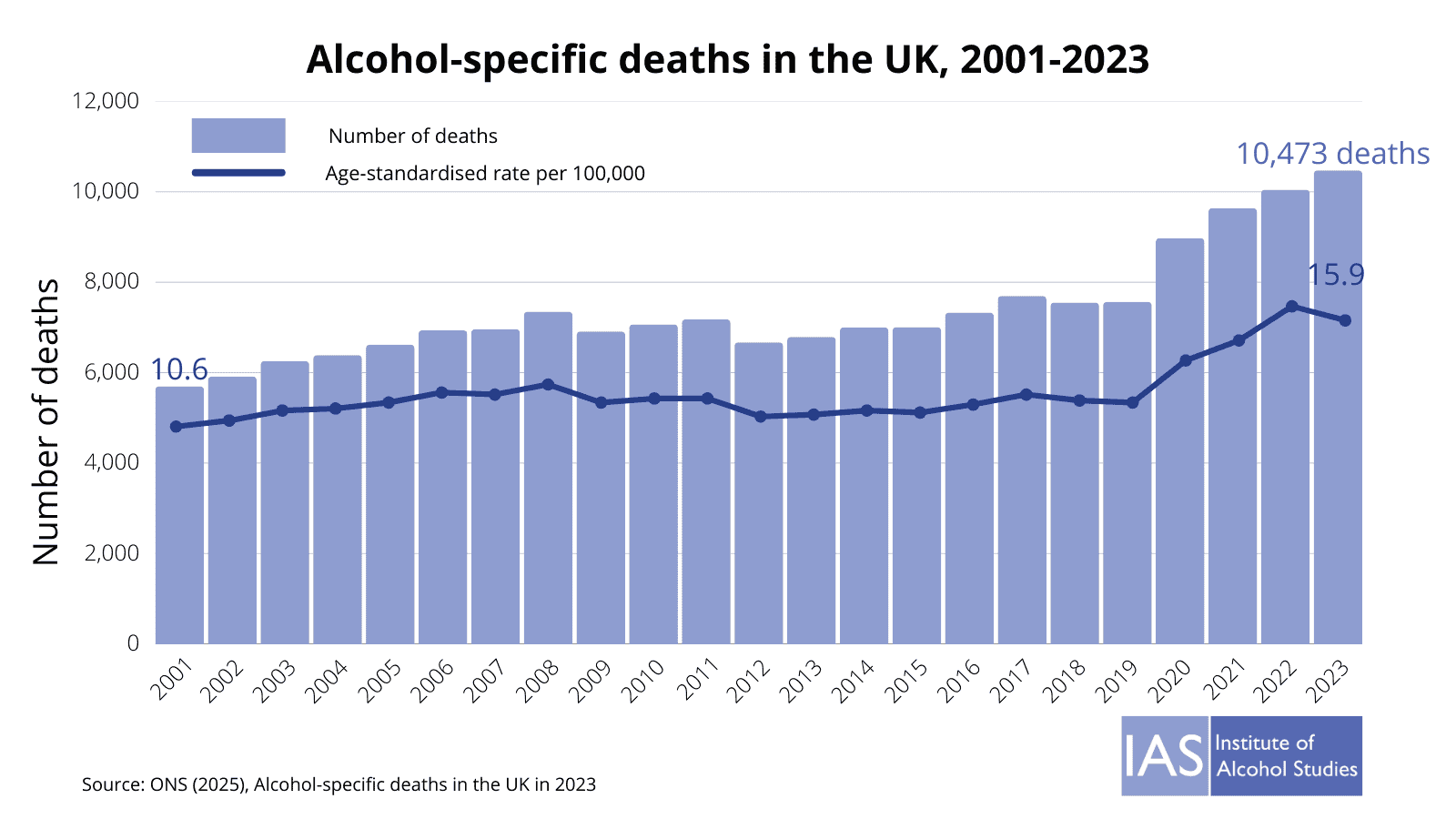 - In 2023, there were 10,473 alcohol-specific deaths registered in the UK, a rate of 15.9 deaths per 100,000 people (Office for National Statistic, 2025)