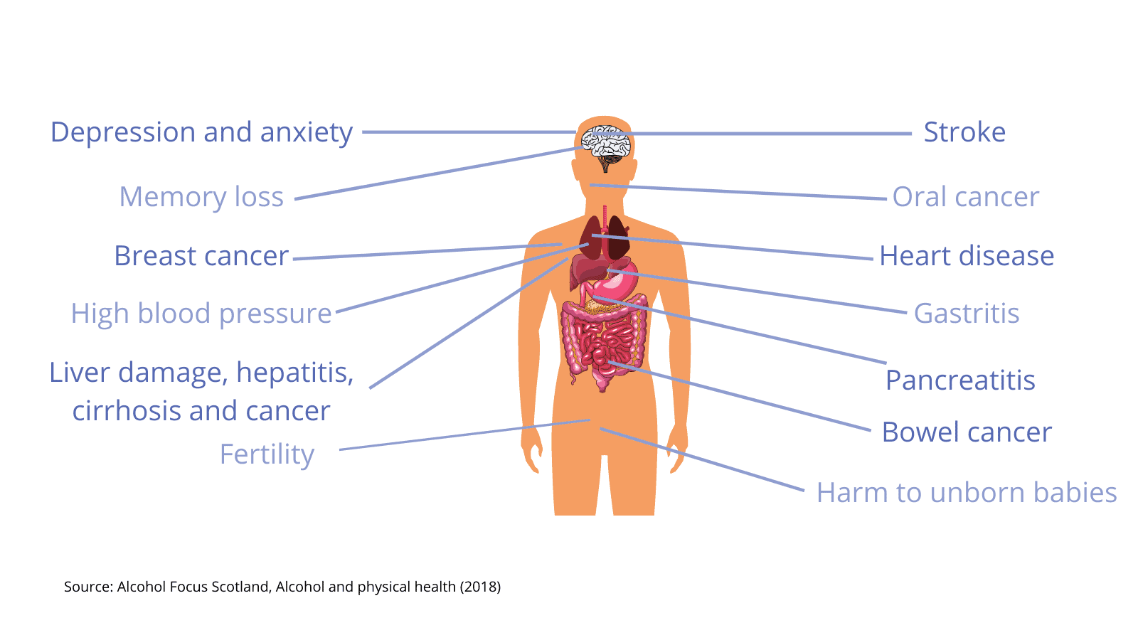 - Public awareness that alcohol causes cancer is very low, with only 13% of people identifying cancer as a health outcome of alcohol consumption (ScHARR)
