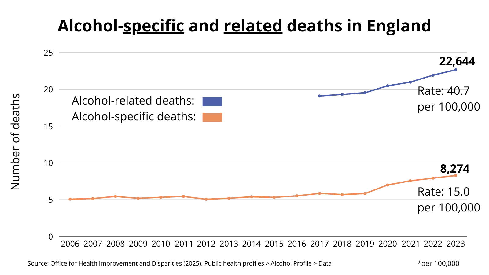 - 21,971 people died from alcohol-related causes in England in 2024 (OHID, 2025)
