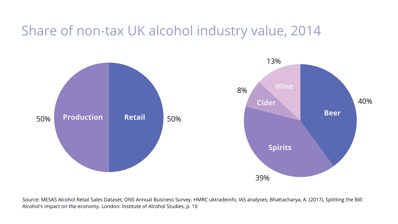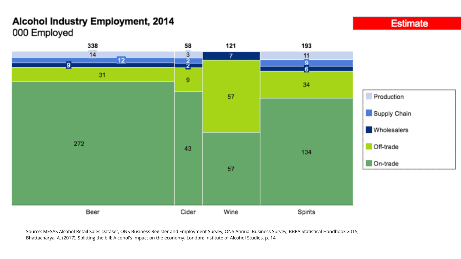The Institute of Alcohol Studies has estimated that the production and sale of alcohol was worth £46 billion to the UK economy in 2014, accounting for 2.5% of Gross Domestic Product and 3.7% of all consumer spending. The vast majority of the economic value of alcohol production in the UK comes from two different activities: brewing beer for the domestic market (largely to be sold in the on-trade) and distilling spirits for export (predominantly Scotch whisky).
