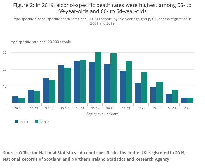 Trend data also indicates that as the mortality rate has crept upwards in that period of time, so the phenomenon of middle-age / older drinkers has become more prevalent: trend data show significant increases since 2001 in the rate of alcohol-specific deaths in people aged 55 to 79 years.