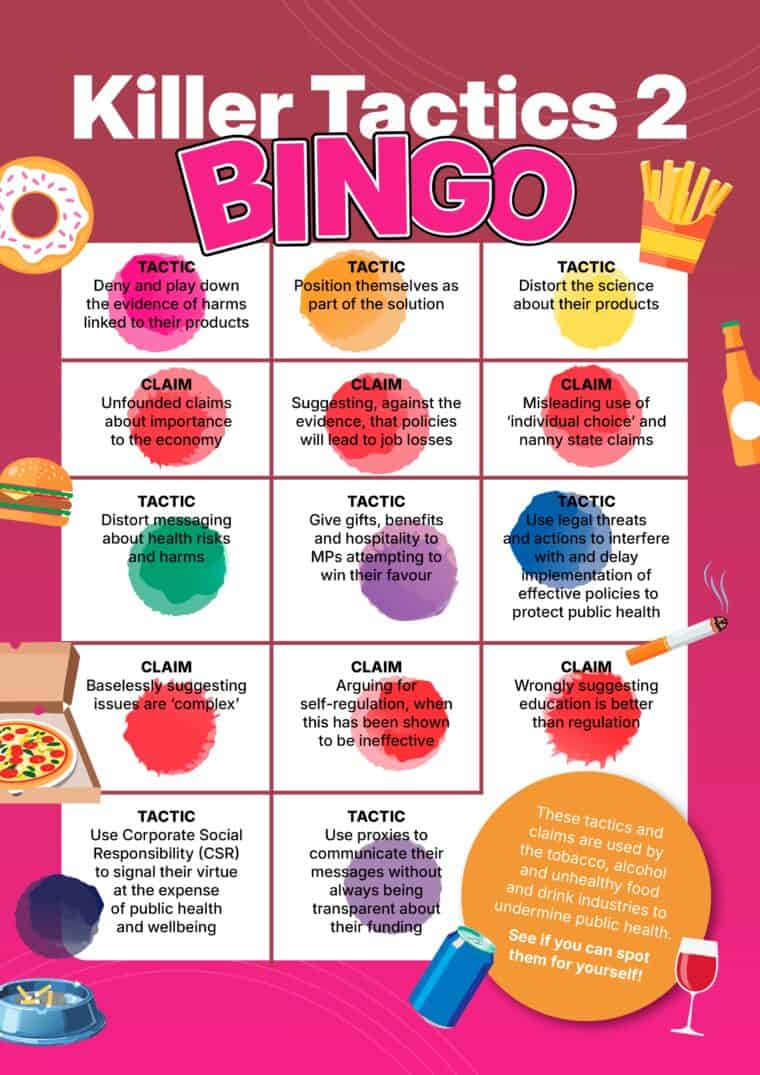 The report also features an updated Killer Tactics Bingo card – highlighting the common arguments and tactics used by health-harming industries.