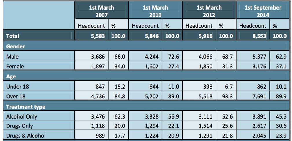 A total of 8,553 people were reported to be in treatment for misuse of alcohol and/or drugs on 1 September 2014.
