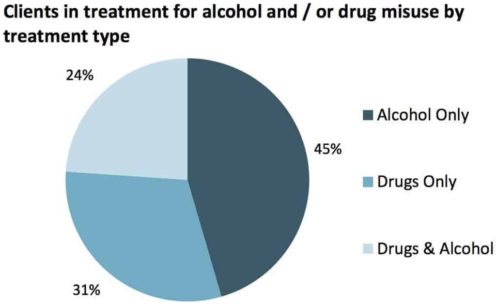 Almost half (45%) were in treatment for alcohol misuse only (3,891 clients), with a further quarter (24%) in treatment for both drugs and alcohol misuse (2,045).