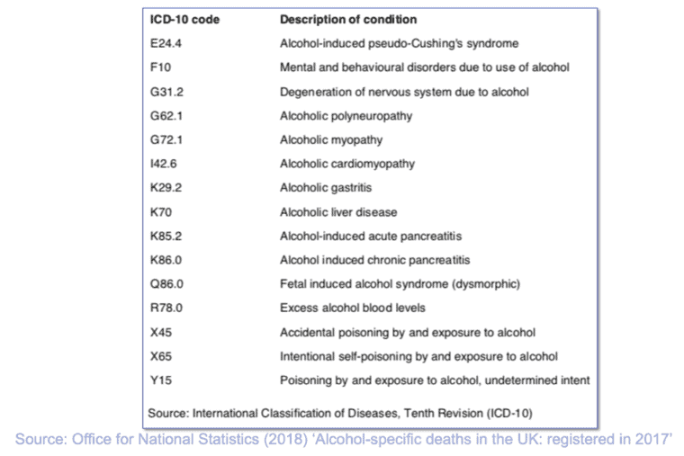 The ONS definition of alcohol-related deaths, is, in fact, alcohol-specific – it only includes wholly-attributable deaths, which are those causes regarded as being most directly due to alcohol consumption (eg all deaths from unspecified chronic hepatitis (ICD-10 code, K73) and fibrosis and cirrhosis of the liver (ICD-10 code, K74, excluding biliary cirrhosis)), even when alcohol is not specifically mentioned on the death certificate.