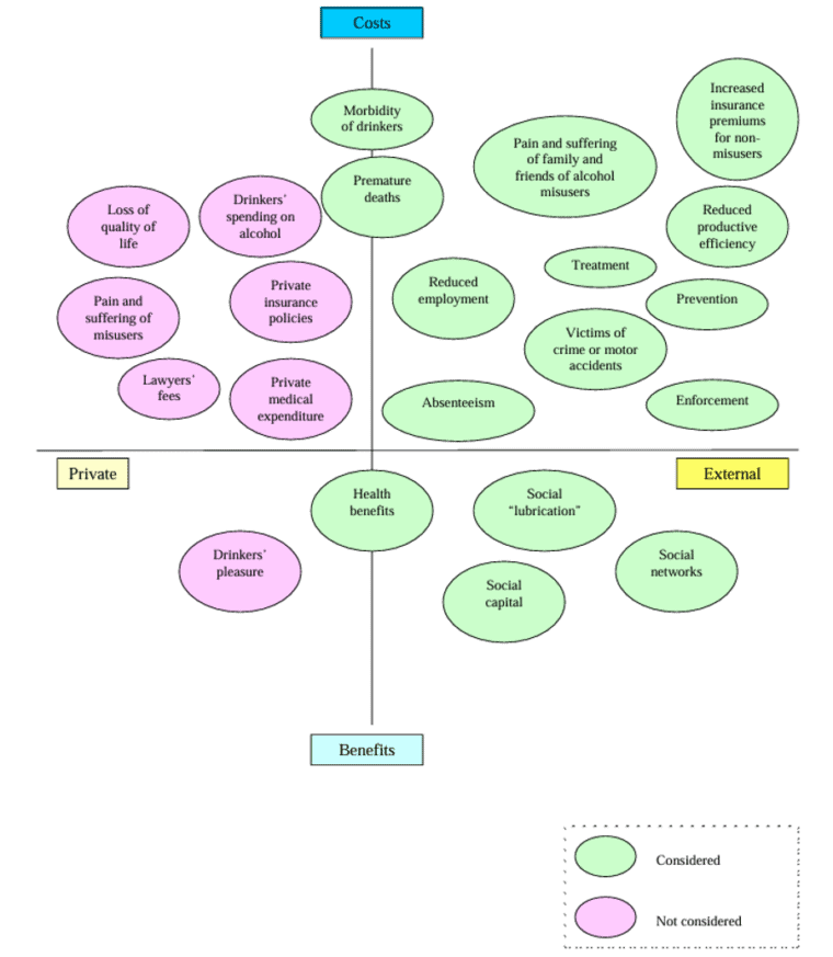 Figure 1, taken from the UK Government Cabinet Office’s report into the costs of alcohol offers an overview of this framework. The purple bubbles represent private costs, while the green ones represent external costs.